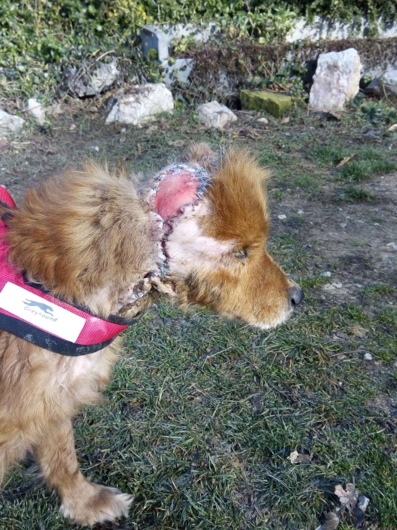 Het verhaal van Archie is weer zo n typisch verhaal over hoe wij in elkaar zitten, we komen nogal eens bij de dierenarts, zo vaak dat we inmiddels goed met iedereen in de kliniek bevriend zijn, omdat we al jarenlang honden opvangen zitten we soms meerdere keren per week in de kliniek en zo gebeurt het dan ook regelmatig dat we daar een hond zien die er ernstig aan toe is maar geen eigenaar heeft, het betreffende dier moet dan na behandeling naar een opvang en dat is geen beste zaak voor een ernstig gewonde hond,de kans dat ze dat niet overleven is dan ook groot. Ook deze keer was het weer raak,onze dierenarts is ook wel zo slim dat als er weer eens een ernstig gewonde hond is ze ons het kamertje inschuift waar net heel toevallig het dier zielig ligt te wezen, ze weet heel goed dat wij daar geen weerstand aan kunnen bieden en het eigenlijk wel zeker is dat wij het betreffende dier mee naar huis nemen.